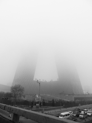 | 3月17日,北京东三环一处高层建筑被大雾笼罩。新华社发 |