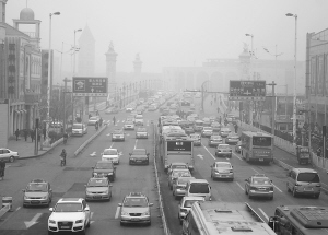| 3月17日,在天津火车站附近,车辆在大雾中缓慢行进。