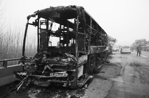 事故现场一辆在人员疏散后被相邻车辆引燃的大巴车(3月17日摄)。 3月17日7时40分至8时许,京福高速苏鲁交界徐州贾汪境内因大雾分别发生4起交通追尾事故,涉及车辆60余辆,截至13时,事故共造成6人死亡、30多人受伤,其中6人重伤。 新华社发(沈鹏摄)