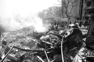 在大马士革安全局刑事分局,记者看到,分局建筑和30多辆汽车被炸毁,地上有一些残肢,鲜血遍地。