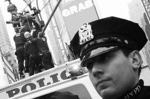 3月17日,美国纽约市警察局技术人员在纽约时报广场上设法将一名男子从一根灯杆上弄下来。当天,一名男子爬上纽约时报广场上的一根灯杆,导致纽约时报广场短暂关闭。 新华社/路透