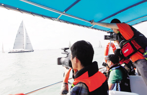 | →三月十七日,在海口湾,媒体拍摄参赛帆船出发时的场景。