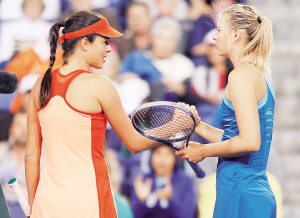 印第安韦尔斯网球赛 莎娃晋级决赛 北京时间3月17日,在印第安韦尔斯网球赛女单半决赛中,伊万诺维奇因伤退赛,莎拉波娃晋级决赛。图为伊万诺维奇(左)退赛后与莎拉波娃握手致意。 新华社发