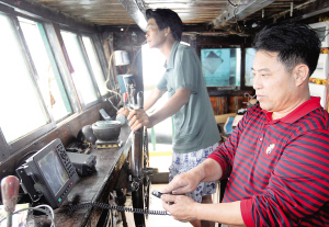 这是一艘上百吨的灯光渔船。在渔船驾驶楼内,装有探鱼仪、单边带电台等,林海深指着一个黑色带有屏幕的设备说:“这就是北斗星通,去年6月装的。”