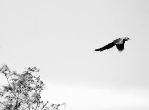 随着一阵唧唧啾啾的鸟鸣,“呼啦啦”成群的丝光椋鸟飞过来,鸟儿很小,飞行的速度很快,“呼”一下飞过木麻黄树梢,停在远处的空地上觅食。“快看,绿嘴地鹃!”卢刚在一边叫了起来,急急地掉转望远镜,寻声觅鸟去。绿嘴地鹃比丝光椋鸟大多了,它“嘎嘎呱呱”地发出青蛙一般的叫声,从一株树枝飞向另一株树枝,它的翅膀微微张开,有长长的尾羽,像一只小小的凤凰。