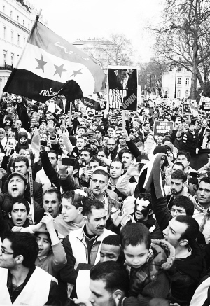 3月17日,在英国首都伦敦,人们在反对叙利亚政府的游行示威队伍中呐喊。 当日,叙利亚政府的支持者与反对者分别在伦敦举行集会。 新华社发(高塔姆摄)
