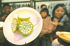 3月20日,在中国杭帮菜博物馆一道精美的莲子菜品吸引游客参观。 当日,中国杭帮菜博物馆在杭州开馆。杭帮菜博物馆追述了杭帮菜数千年发展史,展出110余件反映餐饮文化的精美文物和近200件精致的菜品模型。这座杭帮菜博物馆集杭帮菜展示、体验、培训和经营于一体,将吸引中外游客从中学习、研究和体验杭帮菜餐饮文化的独特魅力。 新华社发