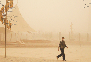 | 3月20日,一名男子行走在浮尘笼罩下的新疆吐鲁番市街头。 新华社发 |