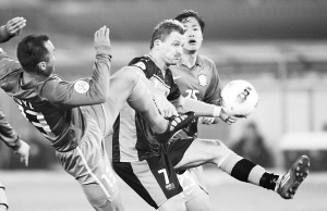3月20日,在2012年亚冠联赛小组赛第二轮比赛中,北京队主场以1:1战平澳大利亚布里斯班怒吼队。图为北京队球员徐云龙(左)与布里斯班怒吼队球员贝里沙拼抢。 新华社发