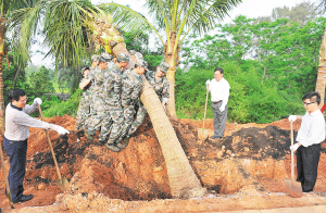 省领导罗保铭、蒋定之、王为璐、肖若海、许俊、陈辞、刘鼎新、谭力、符兴、毕志强、康耀红、陈海波、贾东军、林方略、陈成、李秀领、董治良、王路、陈莉、王宇田,省长助理陆志远等来到龙昆南路延长线,与省绿化委员会成员单位负责人,海口市干部群众、在校学生、青年志愿者,以及驻琼军警部队官兵一起,顶着烈日,挥锨培土,种下一棵棵椰子树、三角梅。