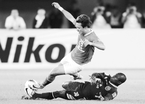 3月21日,在2012年亚冠联赛H组第二轮比赛中,广州恒大队主场1:2不敌泰国武里南队。在另一场比赛中天津队客场1:1平韩国城南一和队。图为广州恒大队球员郜林(上)遭泰国武里南联队球员阿切姆蓬铲断。 新华社发