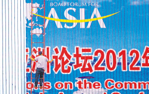 | 3月21日,海口市国兴大道旁,工人正在制作博鳌亚洲论坛2012年年会宣传牌。 本报记者 李英挺 摄 |
