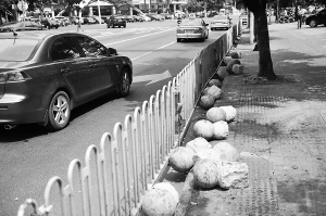 | 海口市玉沙南路与国贸大道交叉口,惨遭破坏的阻车石桩。 本报记者 张杰 摄 |