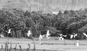 | 十几只鹭鸟在海南新盈红树林国家湿地公园内寻找食物。 本报记者 苏晓杰 摄 |