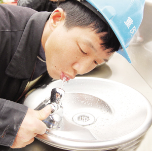 ← 在上海世博会园区内,一名工人饮用直饮水(2010年3月30日摄)。 新华社发