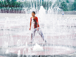 ↑ 河南省济源市最高温度达37℃,一名小学生在济源市一喷泉处戏水纳凉(2011年7月26日摄)。 新华社发