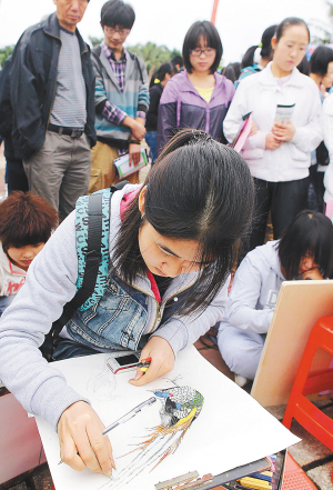 3月24日,一名学生在以鸟为题材在绘画。当日,近千名海师大、海大等多所院校学生环保协会及市民,参加了在海口市万绿园举行的2012年海南省第24届“爱鸟周”活动启动仪式。活动中,放生百只斑鸠、黑水鸡、麻雀等鸟类。展出百幅鸟类及其他动物图片,用歌舞、绘画等形式宣传普及环保知识。该活动由省林业局、省野生动物保护协会、海口市林业局主办。 本报记者 苏晓杰 摄