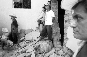 3月23日,在墨西哥格雷罗州的一个小村庄,人们站在被地震摧毁的自家房屋废墟前。 墨西哥格雷罗州夸希尼奎拉帕市市长卡斯特罗22日说,该市有两人在20日发生的墨西哥强烈地震中遇难。这是此次地震中首次发现遇难者。 新华社/法新