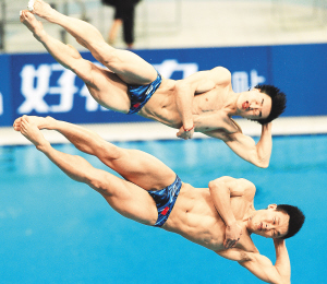 秦凯/罗玉通组合在男子双人3米板上以464.49分获胜。女双10米台决赛也是中国黄金搭档陈若琳/汪皓以360.66分摘金。男子10米台决赛历来最扣人心弦,世锦赛和世界杯冠军邱波收获了5个满分10分,可惜他的第四个动作略有闪失,有惊无险地以566.50分摘金。