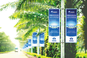 | 3月23日,博鳌亚洲论坛2012年年会临近,琼海市东屿岛年会主会场周围悬挂起论坛年会标识道旗。 本报记者 张杰 摄 |