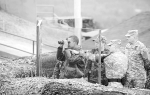 3月25日,在韩朝边境非军事区板门店共同警备区的一个观察哨,美国总统奥巴马用望远镜向朝鲜观察。