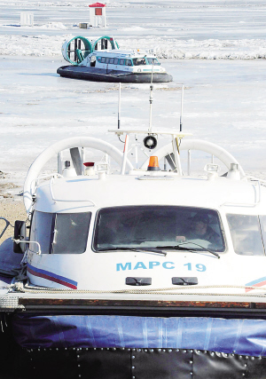 3月26日,中俄界江黑龙江黑河段开通气垫船运输,中俄双方利用气垫船运送旅客往返两国边界。 新华社发(邱齐龙 摄)
