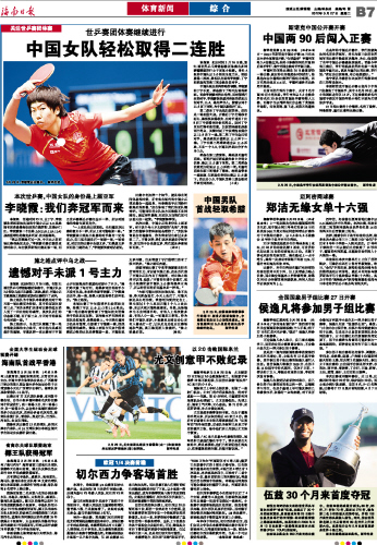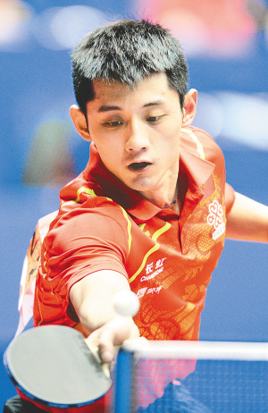 3月25日,在德国多特蒙德举行的第51届世乒赛团体赛中,中国男队首战以3:0轻取希腊队。图为张继科以3:0战胜希腊队选手帕帕乔治乌。 新华社发