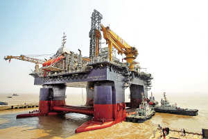 3月25日,中远船务为挪威Maracc公司建造的世界先进深水半潜式钻井平台GM4000在江苏启东顺利出坞。GM4000自重超过2.3万吨,选用大马力推进器及DP3动力定位系统,最大作业水深3000米,钻井深度可达11000米,甲板最大可变载荷达4000吨。GM4000半潜式钻井平台建成后将用于深水油田的勘探钻井、生产钻井、完井和修井作业。 新华社发