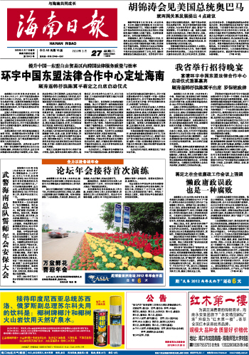 海南日报 首版 001 2012-03-271 2012年03月27日 星期二