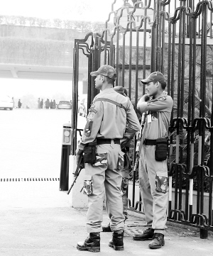 3月27日,印度军警在新德里即将举行金砖国家领导人会晤的酒店前加强警戒。 金砖国家领导人第四次会晤将于28日至29日在新德里举行,印度政府为确保会晤的安全增派人手,加强安保。 新华社发