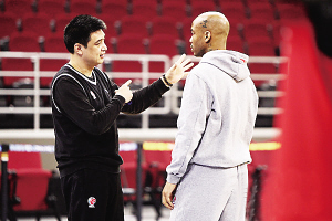| 3月27日,北京队在主场五棵松体育馆训练,备战总决赛第四场大战。图为主教练闵鹿蕾(左)与外援马布里在训练中交流。
