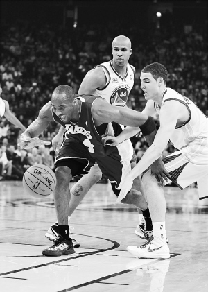 | 科比(左)与勇士队球员汤普森(右)拼抢。 新华社发 |