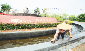 ←3月28日下午,博鳌亚洲论坛2012年年会主会场外,工作人员正在对周围环境进行最后的美化与完善。