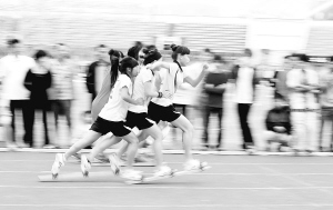 | 三月二十五日,在“三月三”活动会场陵水黎族自治县文化体育广场。群众在进行板鞋竞速比赛。 本报记者 张杰 摄 |