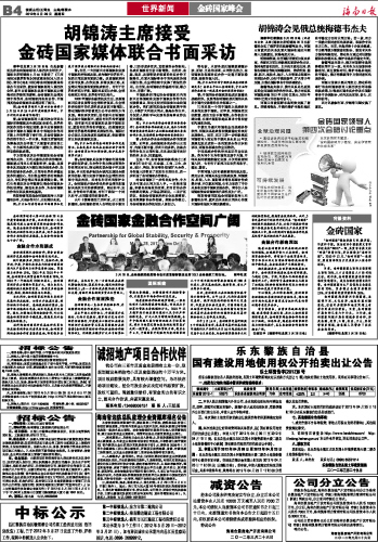 胡锦涛主席接受金砖国家媒体联合书面采访