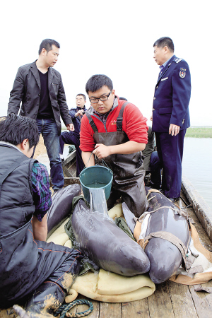 江西 3月29日,工作人员正在对江豚进行养护。 当日,来自中科院、江西省渔政管理局、鄱阳湖区水产动植物救护中心等单位的工作人员将在鄱阳县境内搁浅的江豚捞起,并通过渔船运至1公里外的深水处放生。 3月28日下午,3头江豚在江西省鄱阳县境内搁浅,被当地渔民及时发现。 新华社发