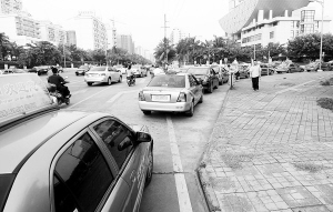 | 等待加气的出租车队列。海南车用沼气新能源示范项目暨澄迈车用沼气工厂3月29日开建,将于今年底建成,届时将全面向海口市公交车及出租车供气。