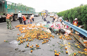 3月29日,在海南东线高速(G98)54公里加200米的西半幅路面上,工作人员在清理路面上的水果。 当天上午,一辆载着水果、车号为“琼A22136”的货车在开往三亚的途中,发生侧翻事故。事故造成司机手部受轻伤,水果翻洒在路面,造成该路段发生短时间堵车。 本报记者 宋国强 摄