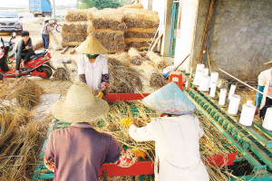 3月29日下午,在临高县临城镇临美路龙波村前的稻草编织加工厂里,工人们正在将成捆的稻草分送进草编机,一把把稻草转眼之间就变成了宽大厚实的草毯。稻草编织加工厂的吕老板介绍说,这些稻草过去村民当成柴禾烧,不值钱,现在编成草毯,就成了瓜菜收购商的抢手货,一个草毯能卖20元,一天一台草编机能生产150个草毯,卖完就收入3000元。