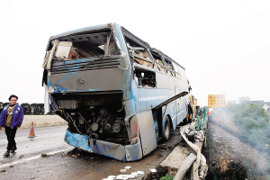 3月29日在湖南省双峰县境内拍摄的事故现场。 当日上午8时左右,沪昆高速公路潭邵段1181公里处(湖南省双峰县境内)发生一起大巴车侧翻事故,至29日12时止,已有5人死亡,另有20余人受伤。此次事故没有对沪昆高速潭邵段通行造成影响。 新华社发