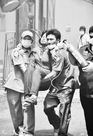 3月31日,泰国救援人员在南部宋卡府旅游城市合艾市一家酒店发生火灾后,疏散一名妇女。 当天,泰国南部宋卡府旅游城市合艾市一家酒店发生爆炸引起火灾,目前已导致至少3人死亡,上百人被困。 新华社/路透