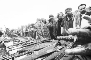 4月1日,在阿富汗西部赫拉特省,塔利班武装人员出席投降仪式。 据阿富汗官员称,当天,35名塔利班武装人员放下武器,向阿政府投降。新华社发
