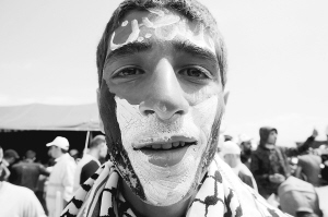 日前,在约旦首都安曼附近的一个村庄,抗议者把脸画成巴勒斯坦旗帜的颜色参加“土地日”示威游行。 新华社发
