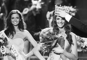 3月31日晚,在乌克兰首都基辅,21岁的选手卡丽娜·瑞隆基娜(右)获得2012年乌克兰小姐冠军。 当天,2012年乌克兰小姐选美大赛在基辅国家大剧院落下帷幕。获得冠军的瑞隆基娜将代表乌克兰参加今年7月在中国鄂尔多斯市举行的第62届世界小姐选美总决赛。 新华社发(斯塔拉斯坚科摄)