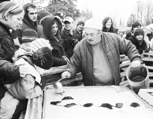 3月31日,在加拿大安大略省伍尔维奇县举行的枫糖节上,商贩将枫糖浆浇在白雪上准备制作枫糖太妃糖。 埃尔米拉枫糖节被称为世界上规模最大的单日枫糖节。加拿大盛产枫树,其中糖枫的树液最适合制作枫糖浆。熬制得滚烫的枫糖浆浇在白雪上后遇冷凝结,成为太妃糖。枫糖浆配薄饼,则是加拿大人典型的早餐。 新华社记者 马丹 摄