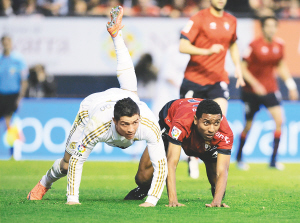 | 4月1日,在西甲联赛中,皇马客场以5:1大胜奥萨苏纳队。图为C罗(左)在拼抢时摔倒。 新华社发 |