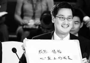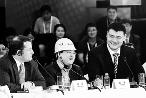 4月1日,博鳌亚洲论坛2012年年会举行青年领袖圆桌会议,与会者就“定义幸福与幸福社会”展开讨论。这是会议嘉宾姚明和网秦移动有限公司首席执行官林宇(中)、美国国家安全委员会原主管中国事务主任韩磊(左)在交流。 本报记者 宋国强 摄