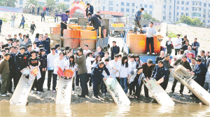4月1日,参加增殖放流活动的人员在长江江西九江段放流鱼苗。 当日,2012年长江春季禁渔及增殖放流活动全面启动,长江江西九江段放流鱼苗约60万尾。长江葛洲坝至下游的上海崇明岛江段从4月1日至6月30日,将开展为期3个月的禁渔工作。长江上游至葛洲坝江段从2月1日至4月30日禁渔。新华社发