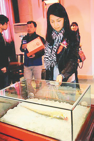 | 参与竞拍者观看冷藏的长江“刀鱼王”。 |
