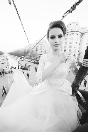这是3月20日,在罗马尼亚首都布加勒斯特,一名模特身穿裙长2750米的婚纱坐在一个热气球上。 |